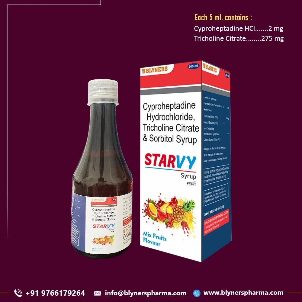 STARVY Syrup is a combination medicine used to treat loss of appetite. It is an effective appetite stimulant. It works by reducing the effect of a chemical messenger which regulates appetite. STARVY Syrup is taken with or without food in a dose and duration as advised by the doctor. The dose you are given will depend on your condition and how you respond to the medicine. You should keep taking this medicine for as long as your doctor recommends. Let your healthcare team know about all other medications you are taking as some may affect, or be affected by this medicine. Starvy : Syrup Pack Size : 200 ml Packaging Type : Bottle with Box packing Brand Name : STARVY Manufacturer : BLYNERS Shelf Life : 24 Months Prescription/Non-Prescription : Prescription Also gives : PCD Pharma Franchise Country of Origin : Made in India Brand - Starvy Syrup